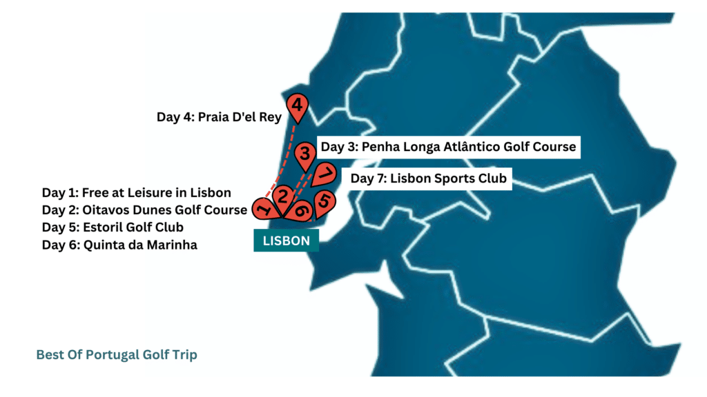 Embark on an unforgettable eight-day golfing journey along the stunning Lisbon and Cascais coastline, beginning with a smooth arrival in Portugal’s capital. Whether you choose to collect your rental car or meet your private driver, your transfer to Cascais is effortless, allowing you to settle into this elegant seaside town. With your first day at leisure, you’ll have time to unwind, explore the vibrant marina, stroll through charming streets, or simply relax and prepare for the exceptional golf experiences ahead.